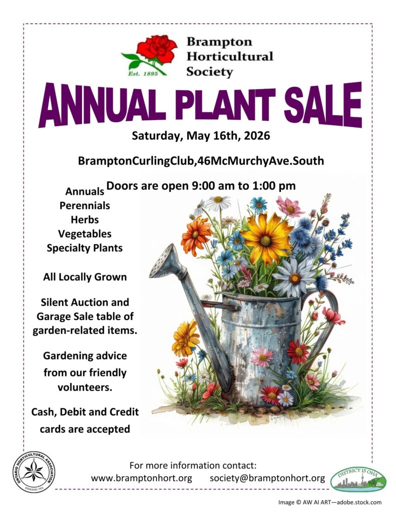 | May 16, 2026 9:00am – 1:00pm | Annual Plant Sale PUBLIC EVENT Brampton Curling Club, 46 McMurchy Ave. S. |